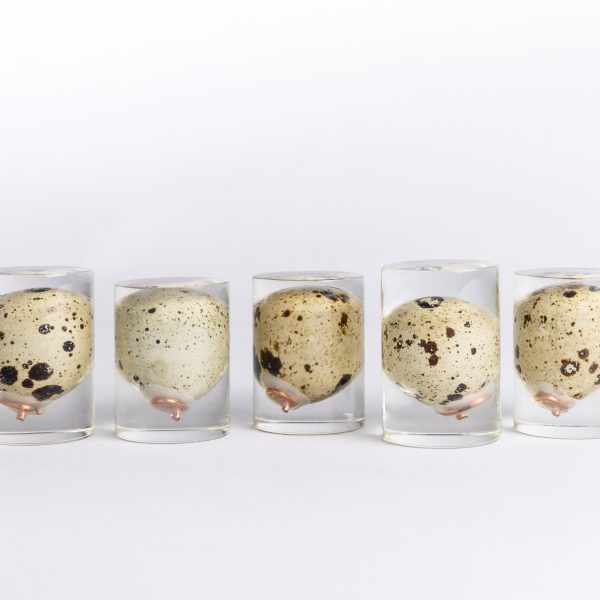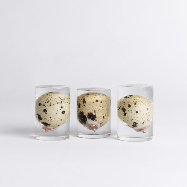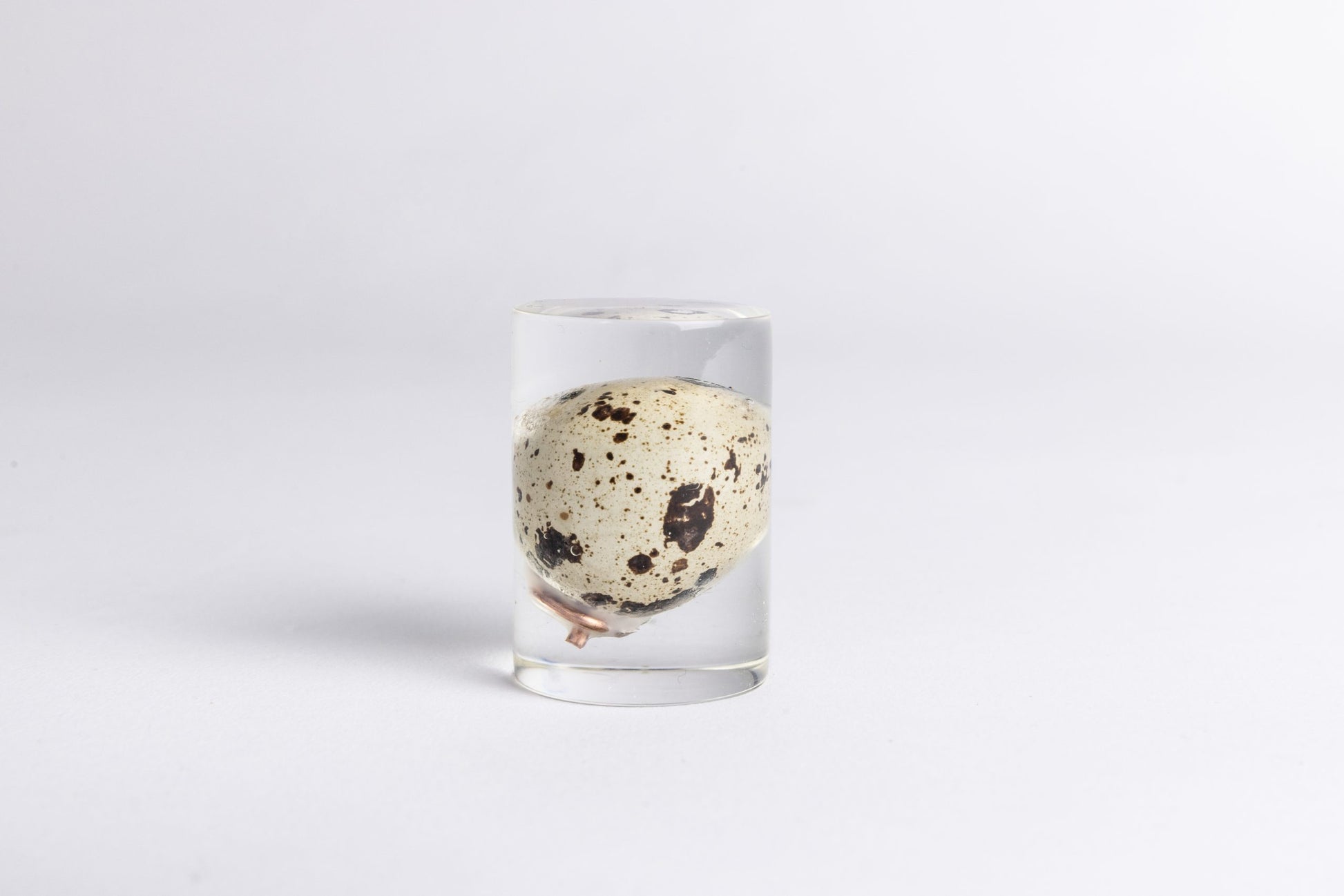 Materiaal: echt kwarteleitje, gevuld met Blue Earth Elixer, omhuld met voedselveilige epoxyhars (stootvast en waterbestendig)