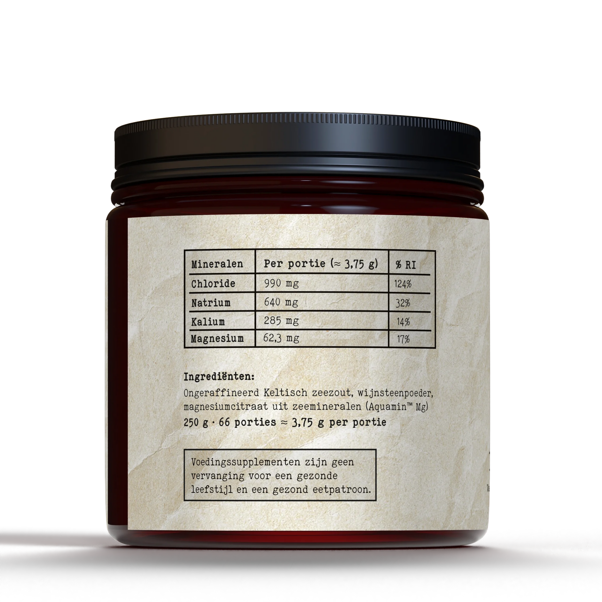 Op basis van Keltisch zeezout, wijnsteen en zeemineralen helpt deze elektrolytenmix je lichaam op natuurlijke wijze te herstellen, zodat jij weer helder, sterk en energiek door kunt.