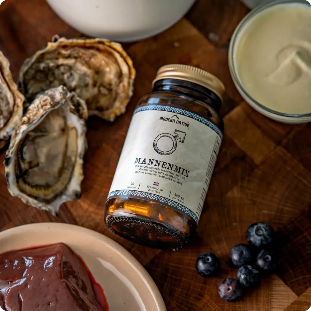 De Mannenmix van Modern Native is een krachtige mix van onder andere runderlever, testikel en oester, ontwikkeld voor mannen die hun lichaam willen voeden met pure, biodisponibele voedingsstoffen. Elke capsule bevat essentiële nutriënten voor energie, vruchtbaarheid, mentale helderheid en een gebalanceerde hormoonhuishouding. Denk aan zink, vitamine A, B12, koper, omega-3, enzymen, co-factoren en specifieke bouwstenen uit de natuur.