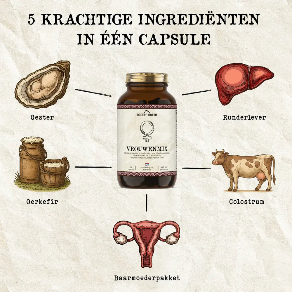 Dit krachtige supplement is voor vrouwen die hun lijf op een natuurlijke manier willen ondersteunen. Deze unieke mix combineert twee van de meest voedzame dierlijke bronnen die er zijn, runderlever en oester, mét vrouwelijke voortplantingsorganen, oerkefir en colostrum. Alles is rauw, gevriesdroogd en zonder toevoegingen.