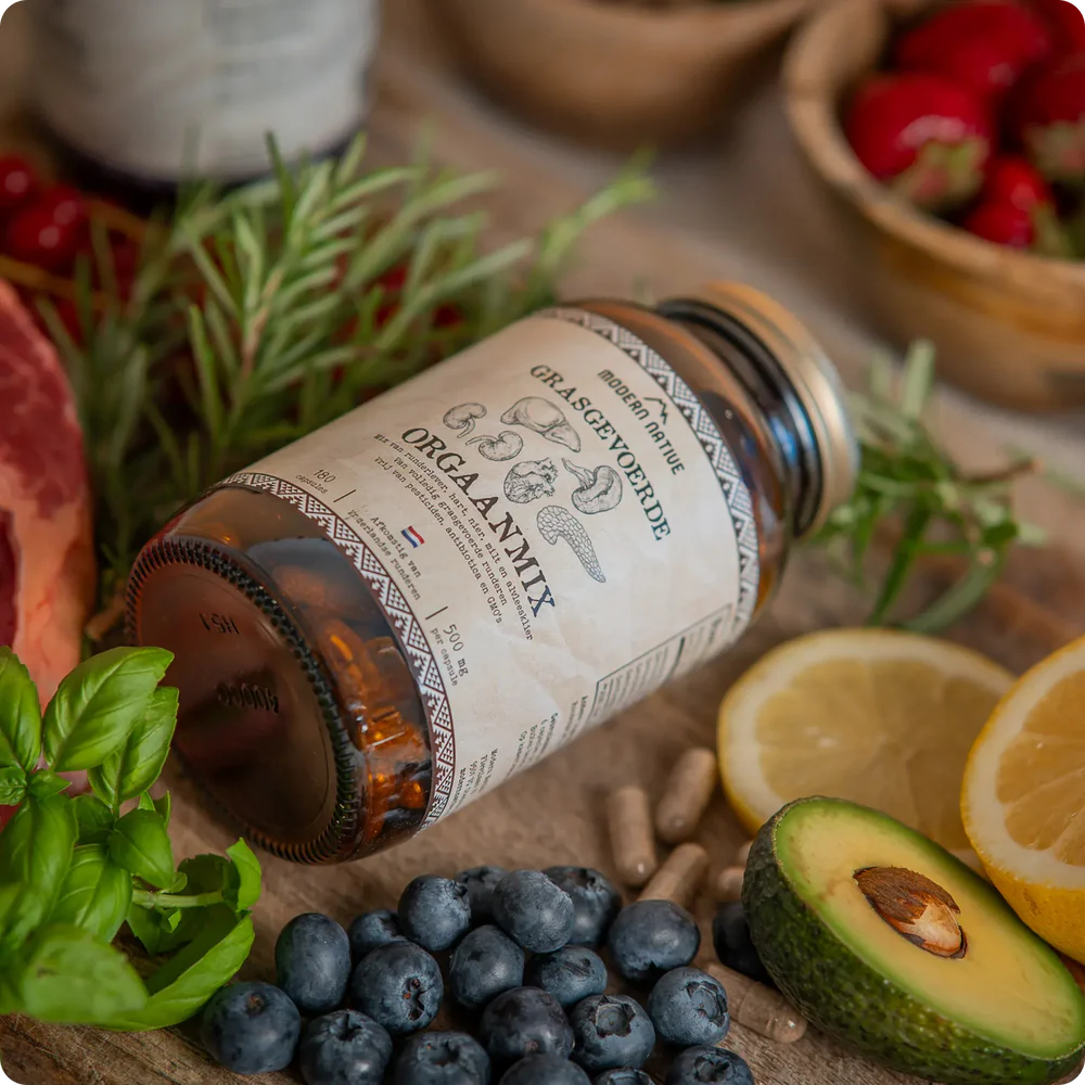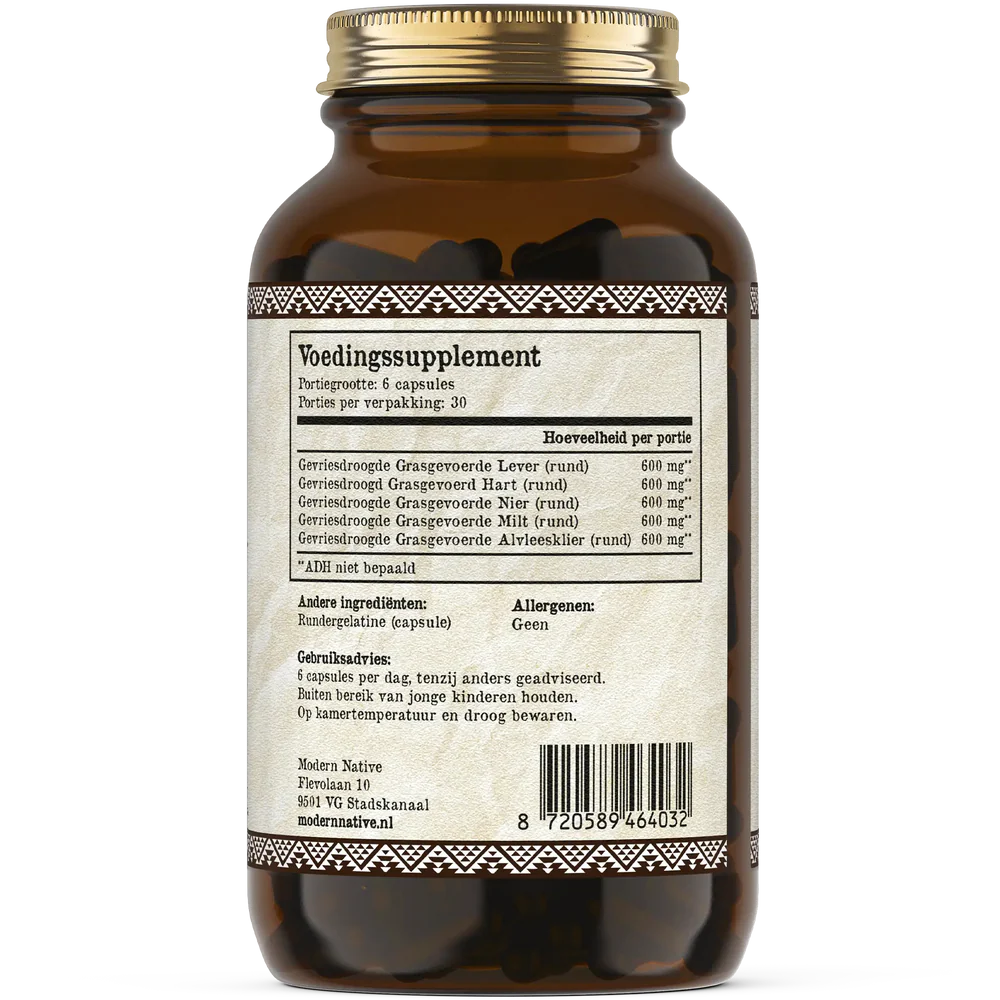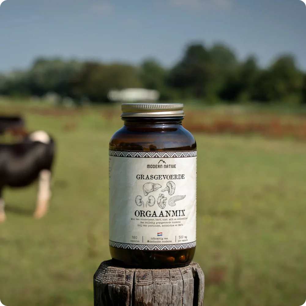 Met de orgaanmix krijg je het breedste spectrum aan voedingsstoffen binnen. De orgaanmix van Modern Native staat uit runderlever, runderhart, rundernier, rundermilt en runderalvleesklier, allen afkomstig van volledig grasgevoerde runderen uit Nederland. Doordat de koeien op natuurlijk grasland worden gehouden en goed worden verzorgd, worden de voedingstoffen optimaal behouden en krijg je hoogwaardiger orgaanvlees.