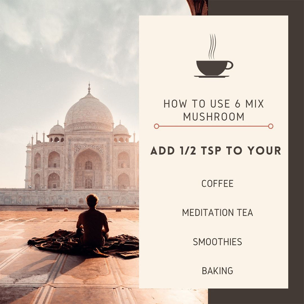 Voeg 1-2 theelepels van de 6mix Mushroom Extract toe aan je koffie, thee, smoothie of proteïne shake. Je kunt 6mix Mushroom Extract ook toevoegen aan je soep of dessert.
